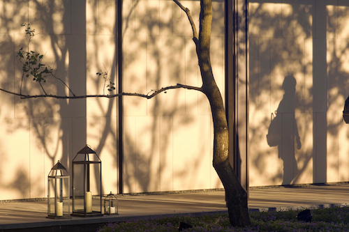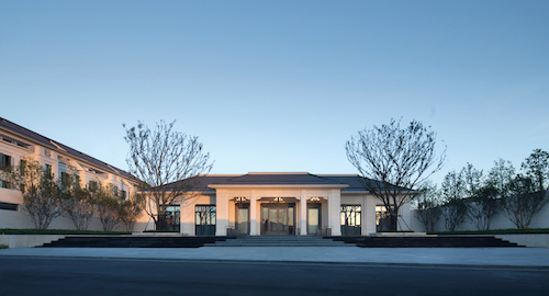 軸線對(duì)稱的序列,干凈大氣的鏡水面,顯示出入口的大氣與品質(zhì)。兩棵叢生樸樹仿佛兩個(gè)最忠誠的衛(wèi)士,守護(hù)這一片凈土與來往的客人。