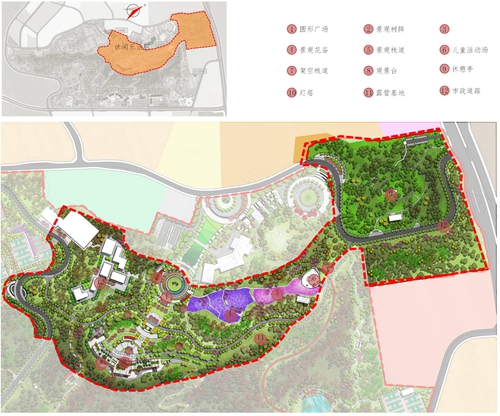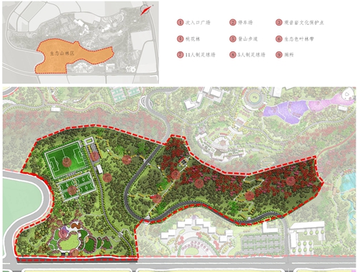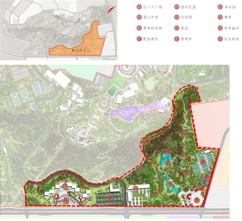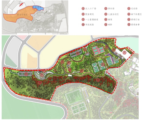 根據地形條件及設計中功能分布情況,將石坪公園整體分為五大分區:入口形象區、休閑樂活區、活力運動區、生態山林區、康體游覽區。