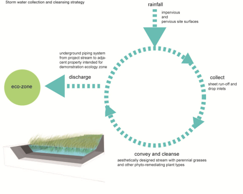 商業零售區包括總部辦公大樓周邊地帶、辦公區庭院花園、渠北路步行道和生態區。生態區位于場地最北邊,是一條具有生態功能的線性景觀,場地中的所有降水都在這里匯集和吸收。