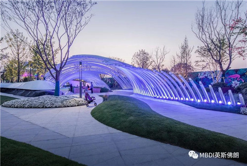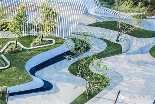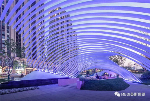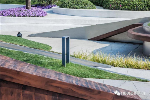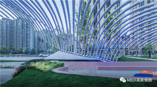 街角廣場(chǎng)是強(qiáng)有力的一道展示界面,采用極簡(jiǎn)的設(shè)計(jì)手法,使用80余根的鋼管組合成光影廊架行程城市記憶點(diǎn),注重年輕客群所關(guān)注的生活要有儀式感,起伏的大地藝術(shù)不僅僅是視覺上的愉悅,配合流線性鋪裝,讓整個(gè)場(chǎng)地具有帶入感。