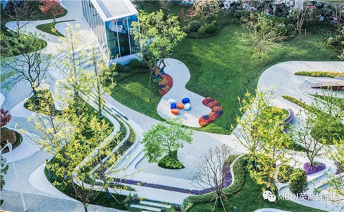 延續(xù)開放、共享的設(shè)計(jì)理念,處理好場(chǎng)地與城市的邊界關(guān)系。把空間還給城市,讓人群參與其中,干凈整潔的草地上設(shè)置一組休閑座椅,配合觀賞草,行程有趣味性的林下空間。