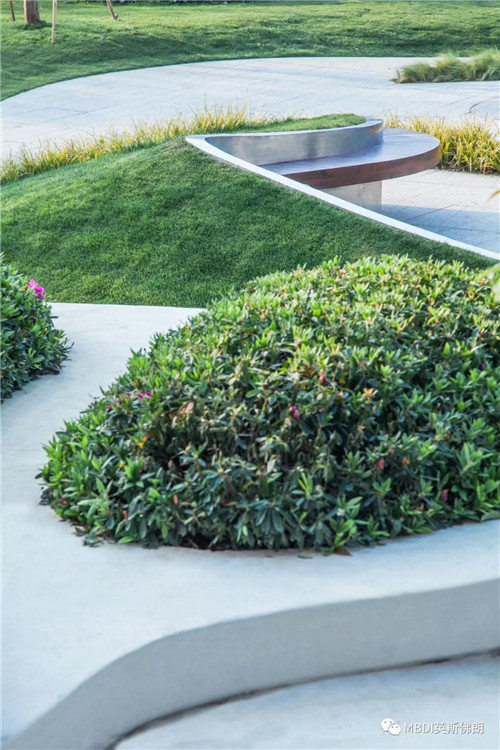 活力階梯相對(duì)應(yīng)的是下沉廣場(chǎng)區(qū)。同樣的大地藝術(shù),同樣的微地形空間,不同的高低變化,讓場(chǎng)地結(jié)尾與開頭形成呼應(yīng)又富于變化。干凈的大草坪點(diǎn)綴靈動(dòng)的觀賞草,孤植的大樹,配合靚麗的景觀座椅,青春亦是如此。