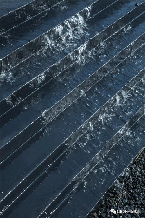 自街角廣場(chǎng)而入,開敞的場(chǎng)地轉(zhuǎn)換為半私密空間。流暢的水景景墻,把廊架、景墻和水景關(guān)系巧妙組合。潺潺的水聲也給這片場(chǎng)地注入了新的元素,年輕而富有活力。這與年輕態(tài)的客群相得益彰。