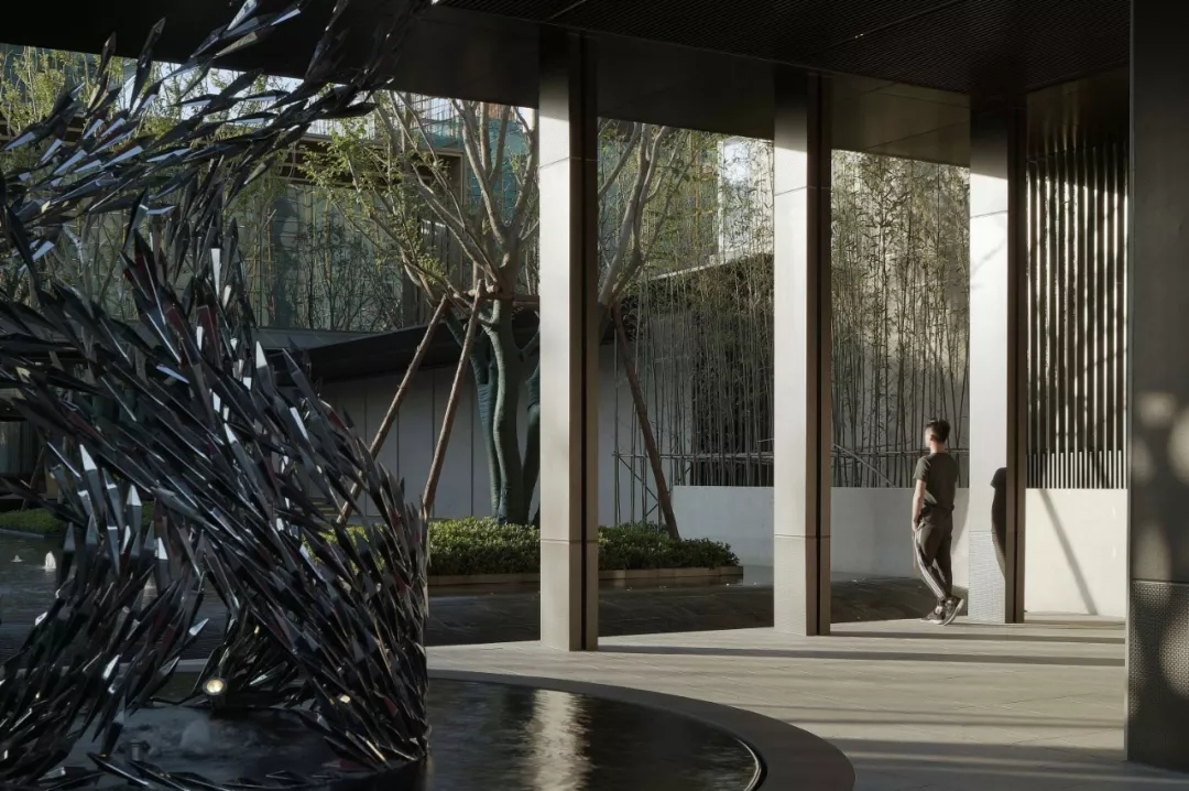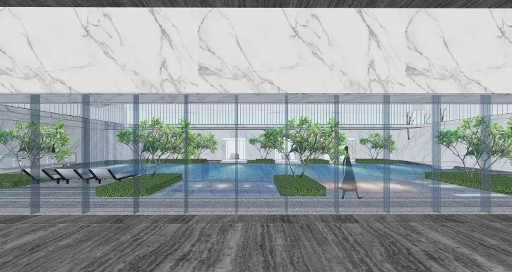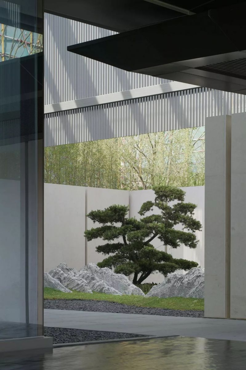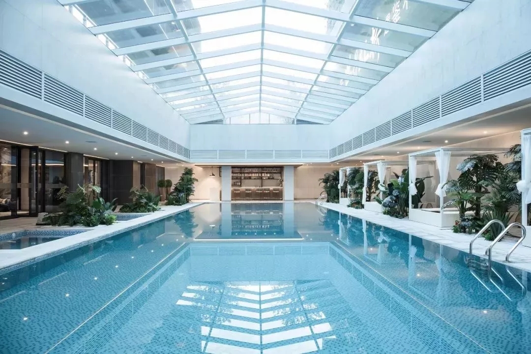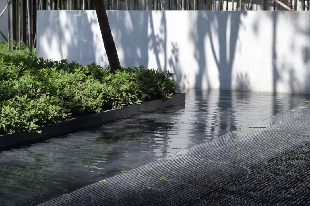 塑造連續的灰空間,同時設計高水幕墻聯系地面與下沉空間,打破高墻,營造出水綠交融的宜人小氣候。大面積的泳池及水療spa池,以最大尺度對摩登生活進行場景化定格,搭配白色涼亭休息區作為停頓穿插其中,體現不凡的現代海派風情。