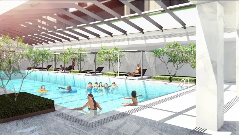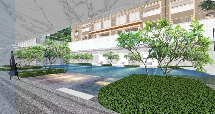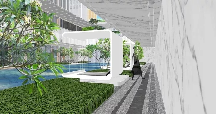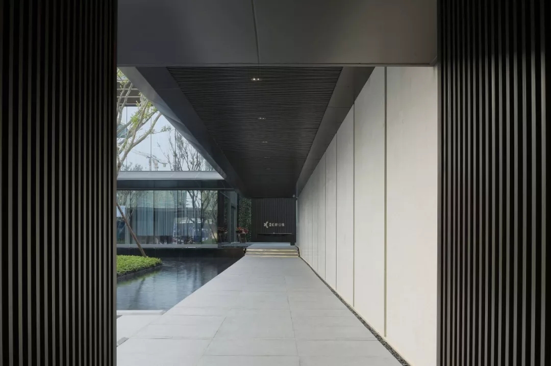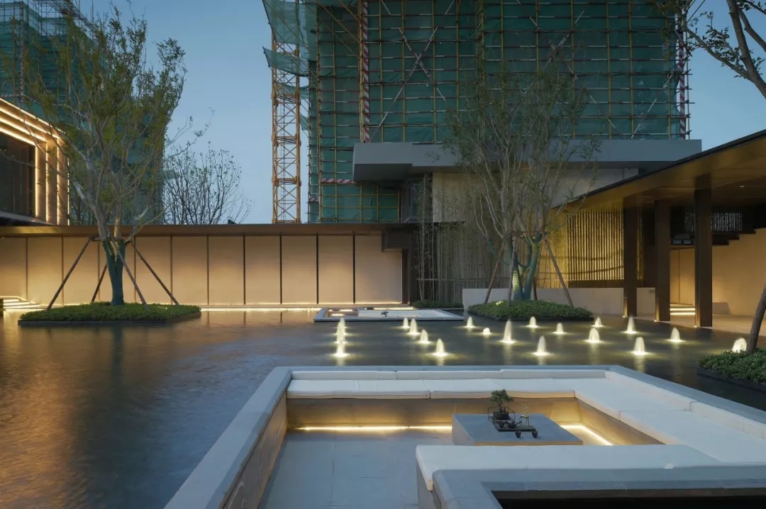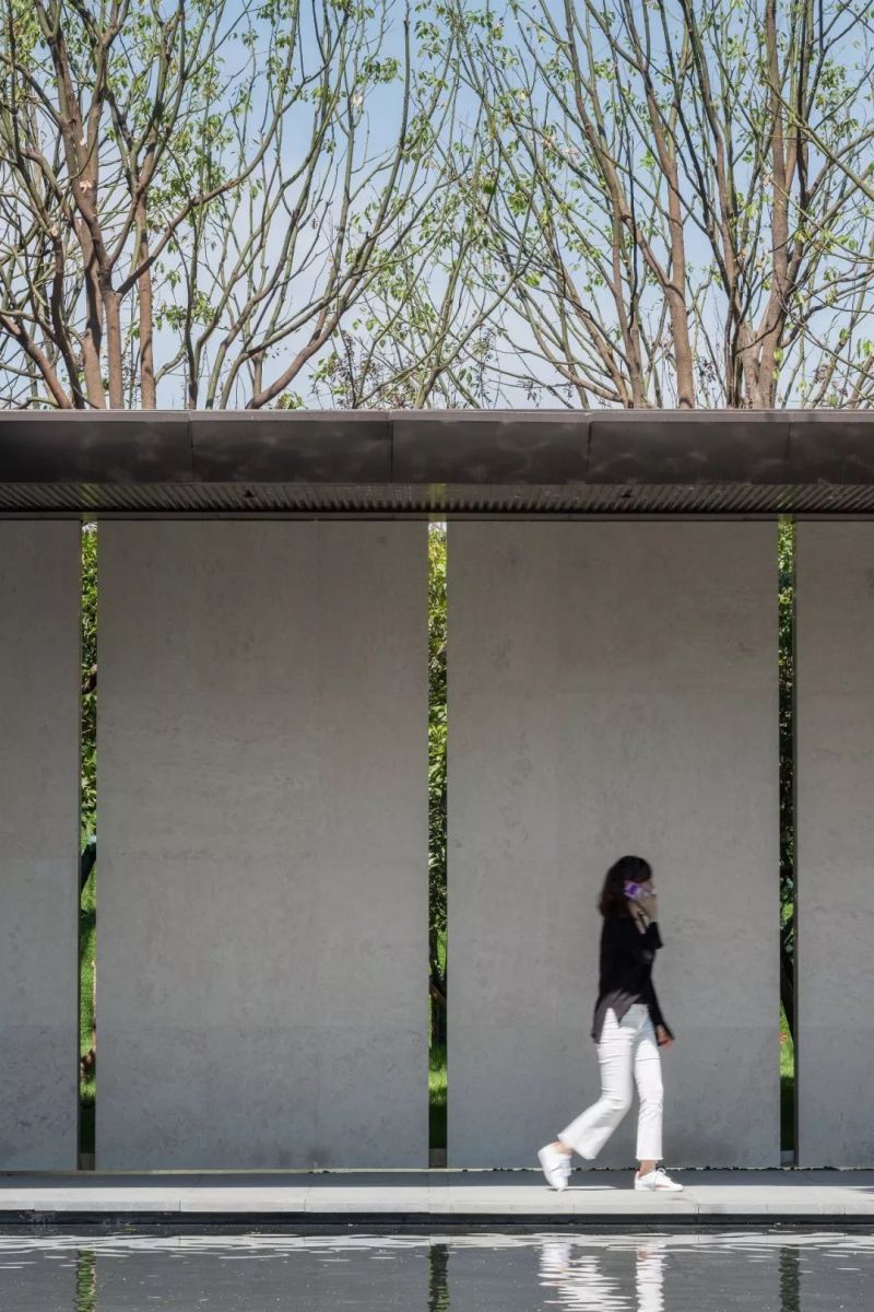塑造連續的灰空間,同時設計高水幕墻聯系地面與下沉空間,打破高墻,營造出水綠交融的宜人小氣候。大面積的泳池及水療spa池,以最大尺度對摩登生活進行場景化定格,搭配白色涼亭休息區作為停頓穿插其中,體現不凡的現代海派風情。