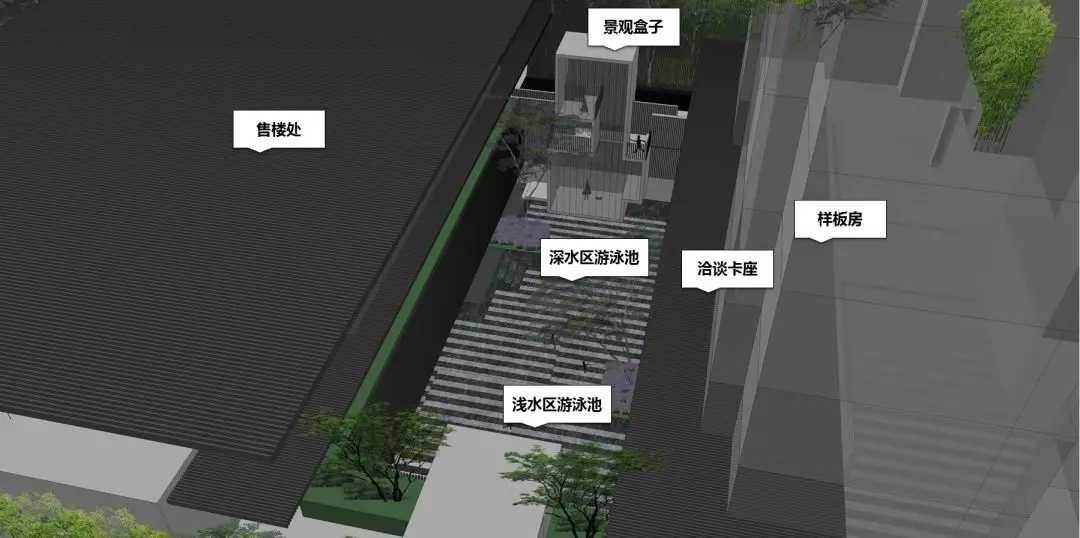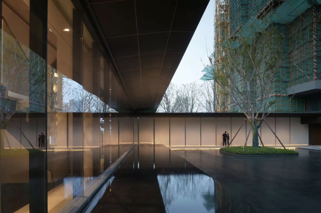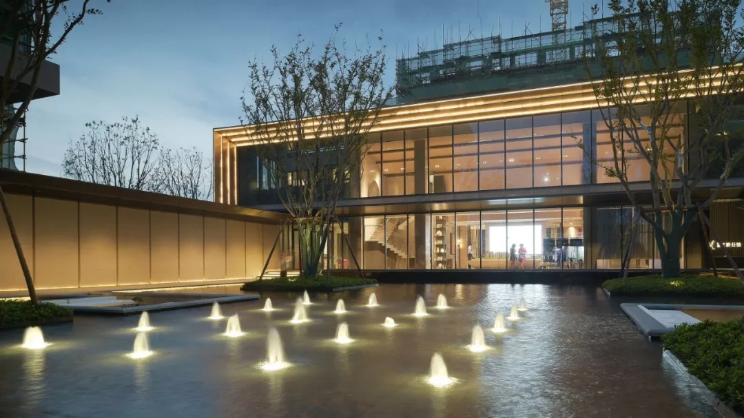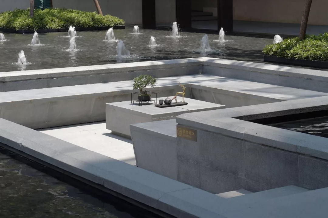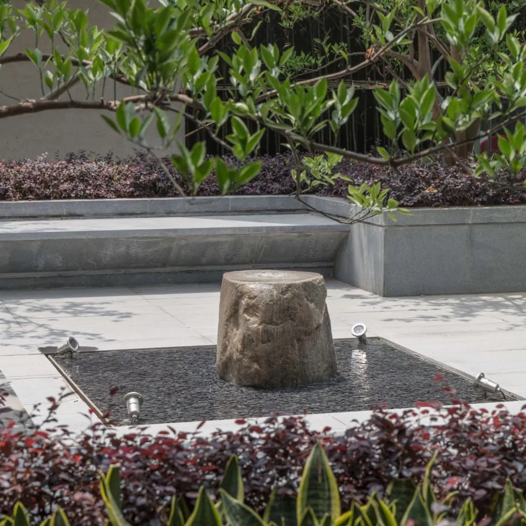 庭中央一池清泉碧波,與售樓處相對而望,妙趣自得。此處,將綠意與生活巧妙引入,營造一處可呼吸的花園空間。傳達生態城市的姿態,流露親近生活又高于生活的理想氣質。水與綠的交融,還原自然最簡潔、最舒適的活力社區。