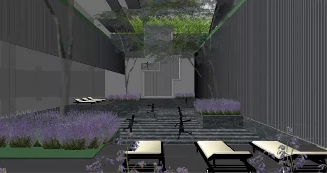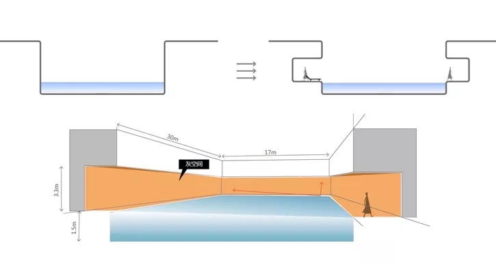 后場下沉泳池空間尺度小,深度較深,與南北建筑缺少聯動,三者關系過于生硬,如何破題“深坑”?