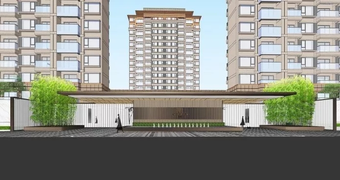 入口空間,即未來大區的人行主入口,是人們第一視覺印象形成的起點,如何營造出尊貴典雅的氛圍及顯貴生活的感受,是設計首先思考的問題。超尺度的主入口設計盡顯簡約大氣,在沉穩的沉香米黃大理石石材中運用少量金屬色裝飾碰撞出前場的不凡氣質。中心雕塑的點綴,增添視覺的焦點。
