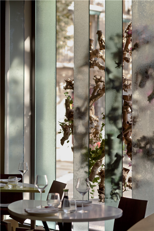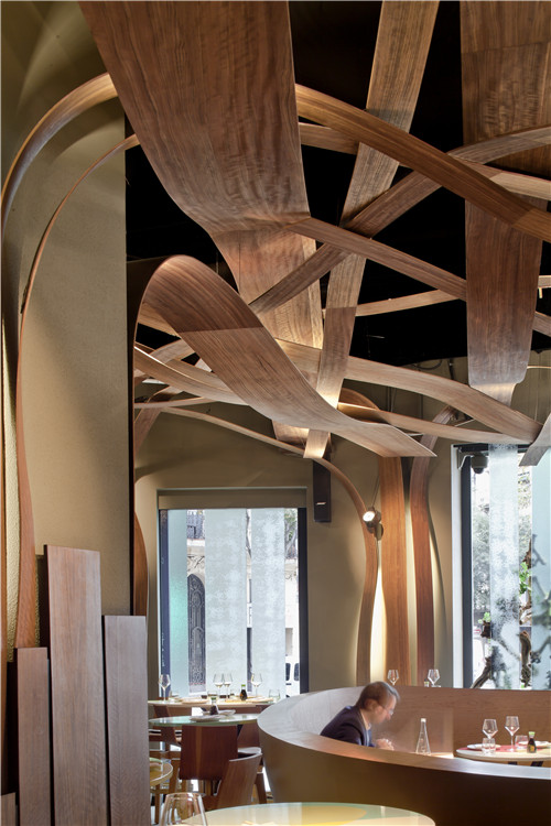 櫥窗里的植物起到了窗簾的作用,在分散光線的同時,連接室內(nèi)與街道的視覺,創(chuàng)造出更加舒適的空間。屋頂由彎曲的樹枝構(gòu)成,在每一個面上都投射出溫暖的光影。