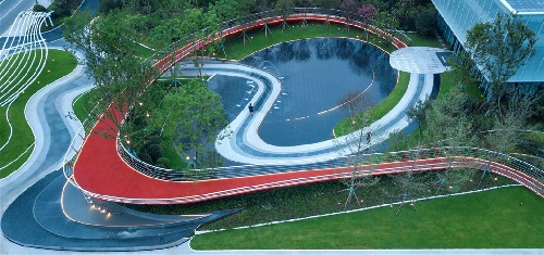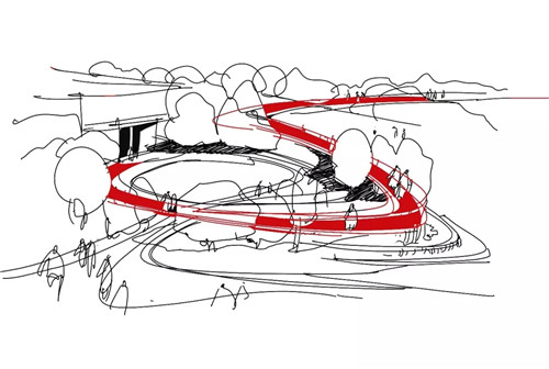 生活的主體是人,為生活而設計,在于功能,在于場地使用率,在于場地的人氣。這條簡單的景觀橋動線,巧妙地化零為整,充滿張力的空間曲線,最大限度地豐富場地流線。