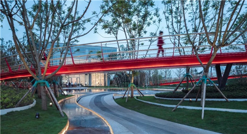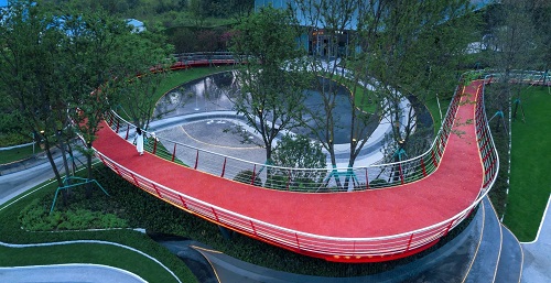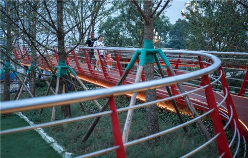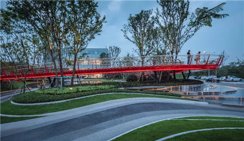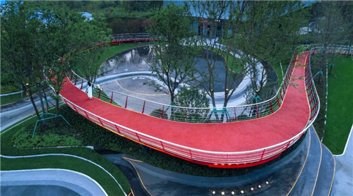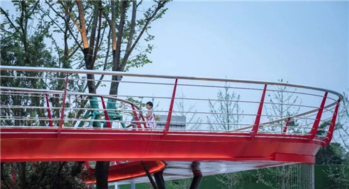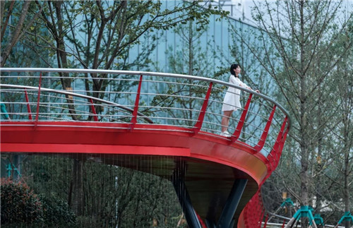 項目獨特場景體驗——“虹橋”,一條120米長的空中景觀帶,在場地上形成高低錯落的空間。紅色,是萬物原色之一,場地大膽地使用紅色,在綠色的詩意營造中,帶來強烈的視覺沖擊力。