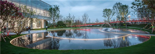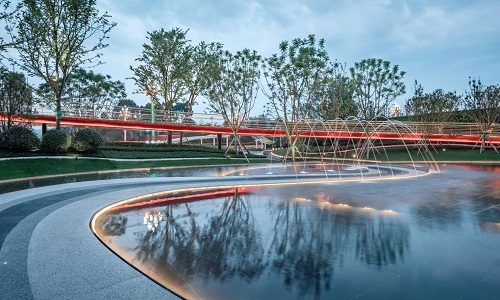 飛躍水面的景觀橋,行走至橋的最高點,一覽場地山水,或觀入口水景,或遠眺街區的行人,安靜的夜里,這里成為人與人、人與自然連接的空間,傳達給居者未來公園式生活理念。