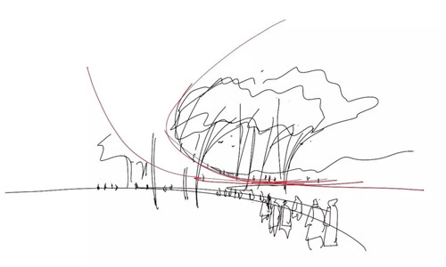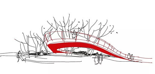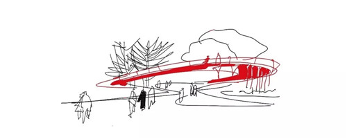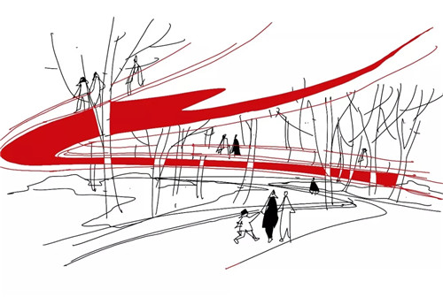 那橋頭眺望的人兒是誰?林中若隱若現紅色的飛橋又通往何處?穿過橋底又是怎樣的光景?所有的想象都隨著曲線的指引,一一呈現。我們看到納涼的老人,玩耍的孩童,還有遛彎的狗……這片新生的場地,設計的初衷,看見生活的美好。