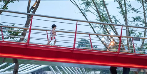 熱情洋溢的紅色,象征著激情、繁榮、生命力。“虹橋”時而臥于水面,時而穿行林中,在感官上帶給我們無限的想象力和思考。只要行走在空間里,便能感知它的生活意趣?!?/p>