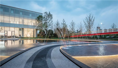 我們在場地上做了一些高差起伏,一方面是為了滿足景觀橋的架設條件,另一方面能豐富人們的游覽體驗:入口先見橋下水幕,再見林中飛虹,穿過橋底,觸發感應跳泉,在水波蕩漾中走向售樓部。