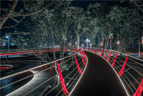 當夜幕降臨,渲染了天空與大地,“虹橋”將成為點亮成都生活的紅橋,這里成為人們夜間活動的“山水生活劇場”。
