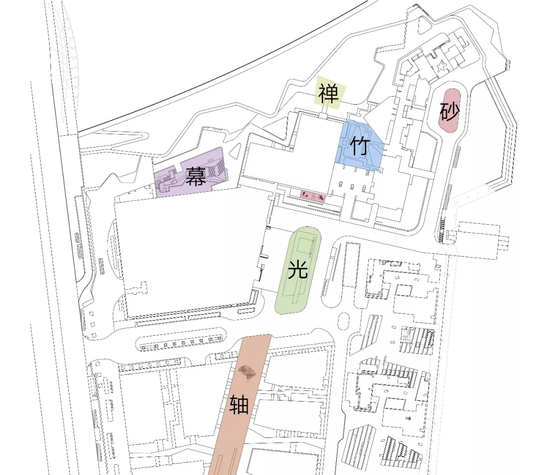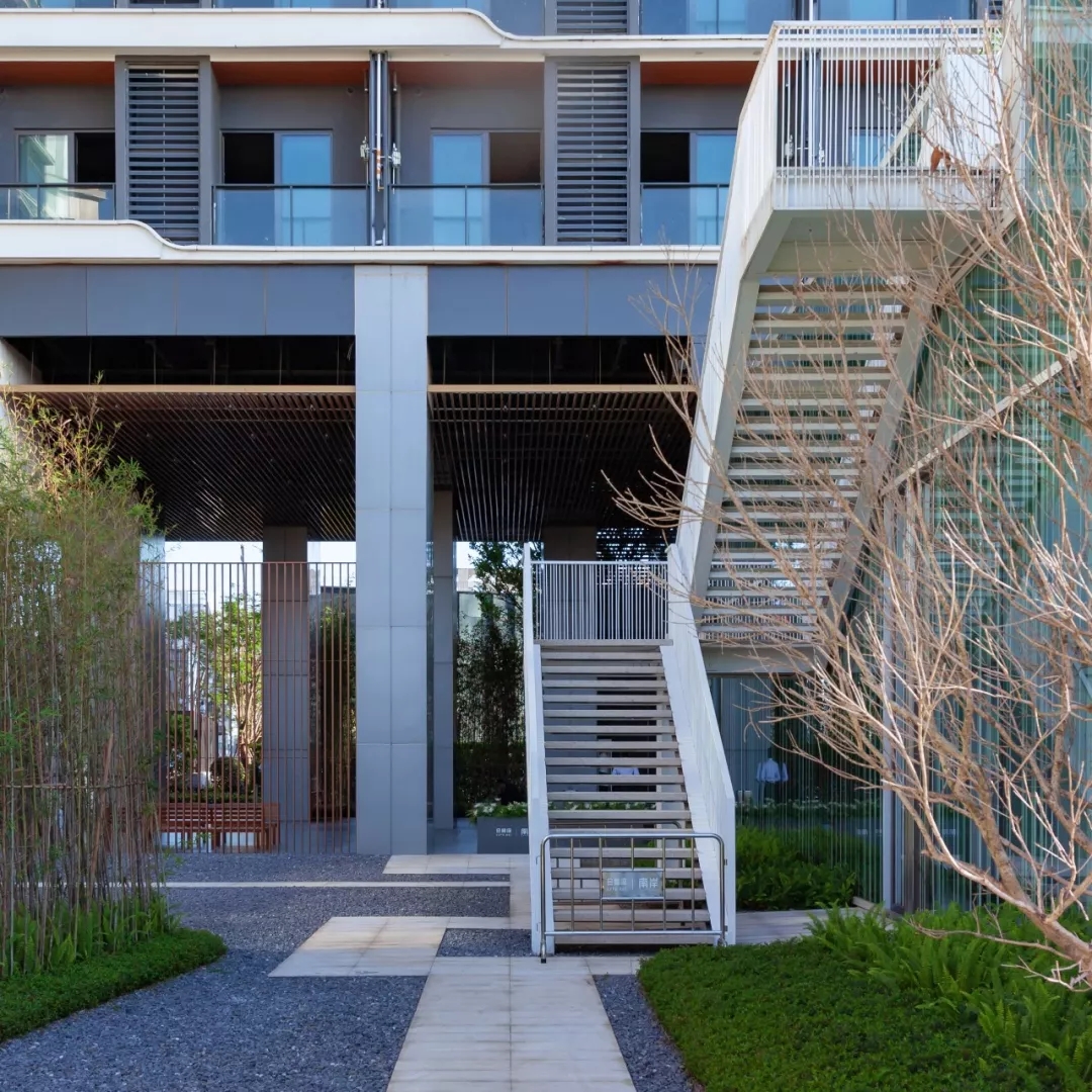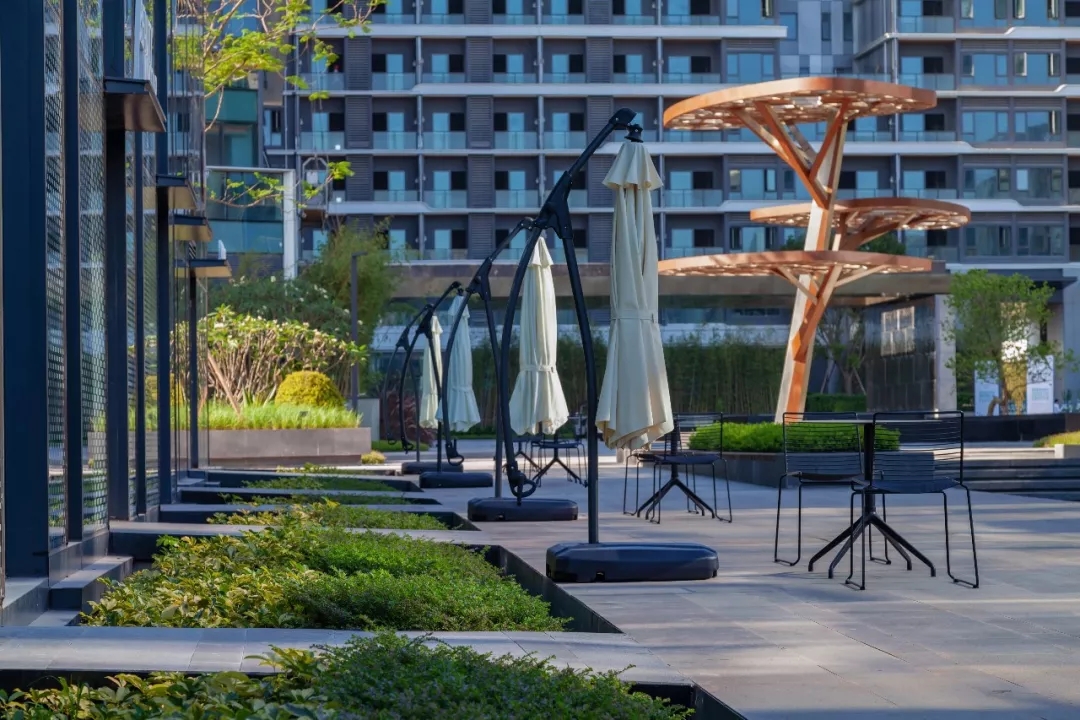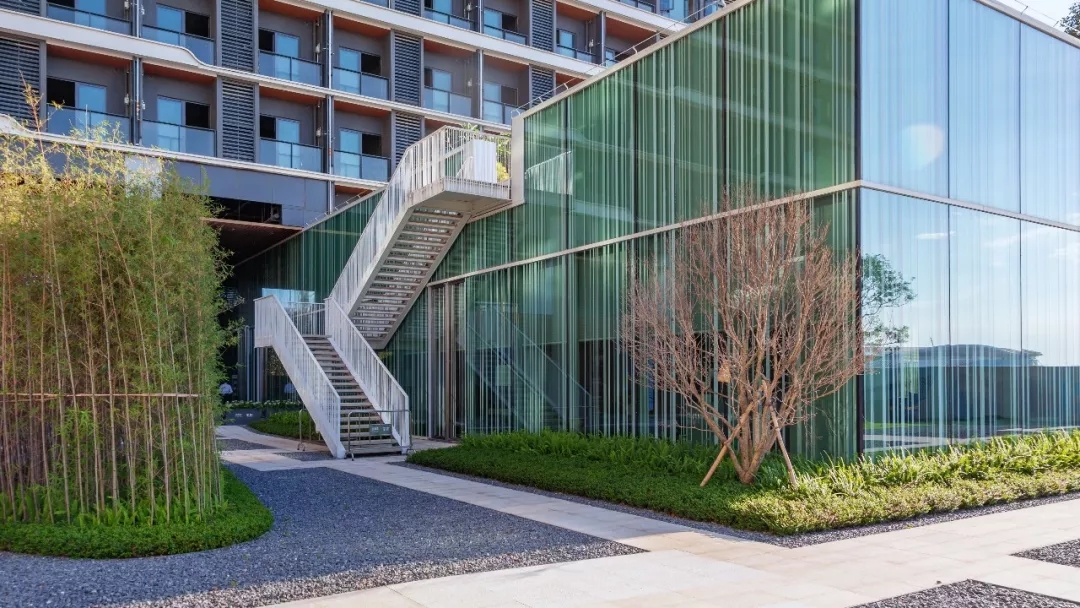 竹因園而茂,園因竹而勝;竹因景而活,園因竹而顯。綠竹成蔭的小徑,使游人在“動(dòng)觀”中感受到深邃、優(yōu)美的意境。拔地而起的竹子呼應(yīng)室外樓梯及建筑玻璃墻豎向內(nèi)飾創(chuàng)造的線性空間,象征著深圳大都市向上的力量,打造有韻律的空間感受。場地上,設(shè)計(jì)利用竹子的不同形態(tài)來分隔區(qū)域,形成半遮半陽、虛實(shí)分隔的空間,使建筑與景觀相互交融。
