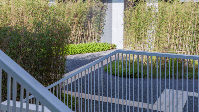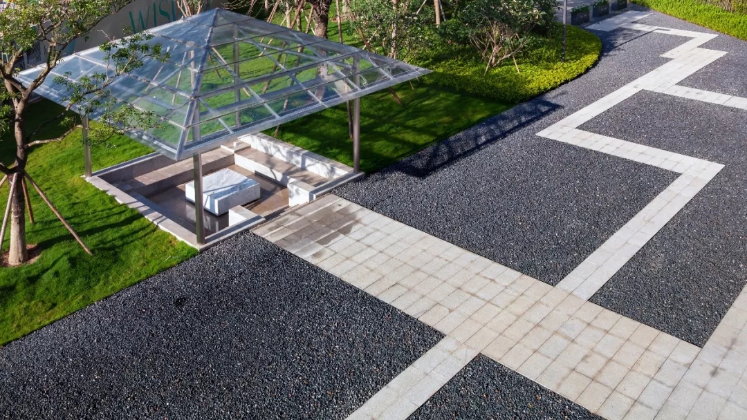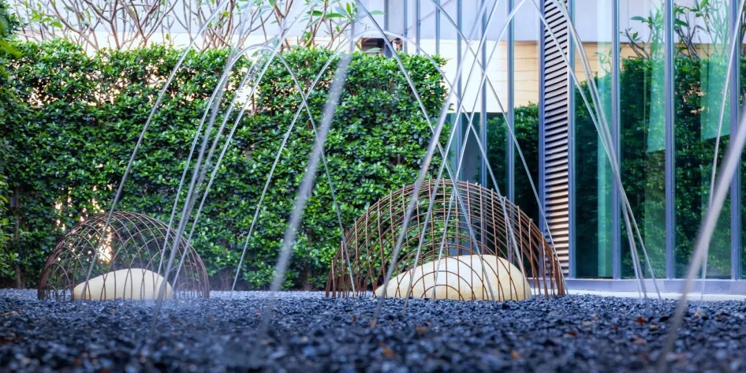 以砂石代替湖海,以石塊代替山巒。流暢的波紋猶如緩緩溪流,干凈明快的灰白色,呈現(xiàn)出其中所濃縮的浩瀚景象及禪意,給人們帶來一種寧靜、深遠(yuǎn)的感觸,創(chuàng)造靜謐舒適的休憩空間。