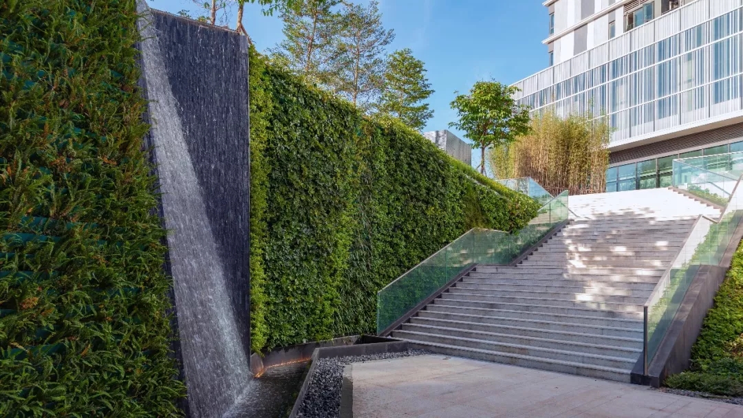 折疊線條圍合的光影下釋放駐留旅人步伐的磁力。休息區(qū)采用下沉式設(shè)計(jì),植物墻設(shè)計(jì)將綠意定格,以鋼板為幕的瀑布潺潺淌過,猶如自然環(huán)境的一面鏡子,呈現(xiàn)出豐富生態(tài)景觀。一番曲徑通幽后拾階而上,在這里,時(shí)光也悠悠然慢了下來。