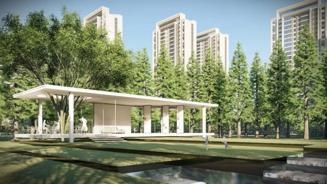 中央綠地與前水景緊密聯系,在靜謐的閱讀空間中伴有潺潺水流之音,給人提供舒適的休憩空間。景觀結合樹木、草地、水景、光影變化的效果,打造大自然森林場所。