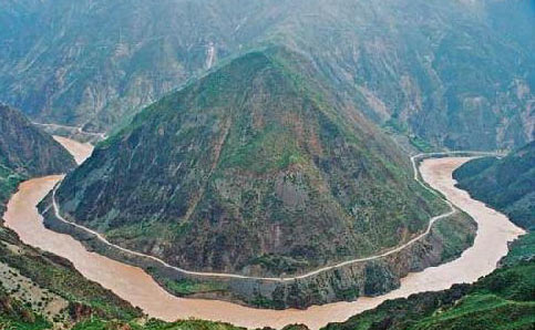 金沙江第一灣位于川滇藏三省區(qū)結(jié)合部的得榮縣子庚鄉(xiāng)境內(nèi)。由北向南縱貫全境的定曲河,在先后接納了瑪伊河和碩曲河之后,攜三江之水投入了金沙江的懷抱,在江水匯合處,形成“三壁夾兩江”的奇景。穿山越谷而來的金沙江,由此水勢(shì)更加浩蕩,峽谷逐漸開闊,在即將沖出這川滇要塞之時(shí),它似乎想先舒緩一下長途奔波的疲勞,于是放慢腳步,圍繞著金字塔般的日錐峰瀟灑地畫了一個(gè)“Ω”字形的大拐彎。孰料這不經(jīng)意的即興之作,竟成就了一處奇觀。