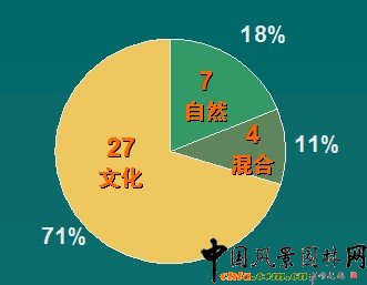 2009: 至此中國共有38項世界遺產,其中27 項文化遺產、7項自然遺產,4項混合遺產。包括:1987年6項:長城、泰山、故宮、莫高窟、秦皇陵、周口店北京猿人;1990年1項:黃山;1992年3項:九寨溝、黃龍、武陵源;1994年4項:承德避暑山莊、曲阜孔府孔廟、武當山古建筑群、拉薩布達拉宮;1996年2項:廬山國家公園、峨眉山與樂山大佛;1997年3項:麗江古城、平遙古城、蘇州古典園林;1998年2項:頤和園、天壇;1999年2項:武夷山、武夷山;2000年4項:青城山與都江堰、皖南古村落 - 西遞、宏村、龍門石窟、明清皇陵;2001年 1項:云岡石窟;2003年1項:云南三江并流;2004年1項:高句麗王城與陵墓;2005年1項:澳門歷史中心;2006年2項:殷墟、四川大熊貓棲息地;2007年2項:開平碉樓與村落、中國南方喀斯特;2008年2項:福建土樓、三清山國家公園;2009年1項:五臺山;