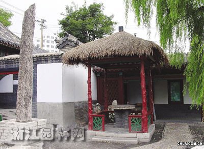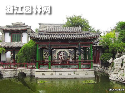 十笏園,又名丁家花園,位于山東濰坊市胡家牌坊街,面積2000平方米。地處山東平原的濰坊縣在清代是一個商業活動頻繁的地方。這里曾經有十六座古園。在清光緒年間建成的十笏園就是其中最著名的一座,也是僅存的一座。由于濰坊處于南方和北方的交界地,故園林的風格也顯出南方和北方兩種風格。這里的商人、文人既可南下蘇杭,也可北上京都。兩處各具的優點長處在這個宅園中也表現得淋漓盡致。怪不得,當年康有為在園中居住三個晚上后寫了《十笏園留題》:“峻嶺寒松蔭薜蘿,芳池水石立紅荷。我來山下凡三宿,畢至群賢主客多!眻@中不僅松蘿蔭深,而且池清亭秀。高朋滿座,文士競騷,給這個私家園林更增添了文人氣氛。 園主名丁善寶,字黻臣,號六齋,在咸豐年間因輸巨款而捐得舉人和內閣中書之銜。他作為濰坊四大豪紳之一,能詩能文,還著有《耕云囊霞》等文集。他游歷了大江南北,并于清光緒十一年(1885年)購得明代刑部郎中胡邦依的故居,在改建的時候辟一區宅園,這個小如笏板的園林,按園主說園太小只“十個笏板”大,故名十笏園。當時,他延請了他的文友蒯菊畦、劉子秀、于敬齋三人設計,造園只有8個月就竣工。一時名家匯集,歌詠觴事不斷,安邱的王端麟有《沁園春》一詞贊曰:“三弓隙地拓開盡,子久云林費剪裁。有方塘半畝,鏡湖瀲滟,奇峰十笏,靈壁崔嵬,曲榭留云,清泉戛至,野草閑花自栽。蕭閑甚,是看山已足,五岳歸來。”平度的白永修有《十笏園題句》道曰:“赤欄橋畔水亭西,亭下微風飏釣絲。荷葉染衣花照眼,令人錯認鐵公祠。” 十笏園西接郭家巷,東、北是宅院。全區分三跨。東西都是較為疏朗的園林式庭院。中跨是純園林。三跨并行,中跨辟園,呈現前園式,與江南園林的后院式、別院式還是有所差別的。 中區水池占了三分之一的面積,是園林的戲劇中心。把四照亭置于園池的中心部位,這是大園水景的處理手法,如拙政園的中島,但在小園中都是沿邊近水布局建筑,如退思園的鬧紅一舸、網師園的月到風來亭、獅子林的荷花廳等。四照亭,四面都是三開間,當心間大,稍間小,呈南北狹,東西窄平面,屋頂三重檐,檐檐相疊。名為亭,其實是榭,四面設美人靠,任人憑望。所謂四照,即四面可觀。東觀山亭,西觀曲廊,北賞硯香層樓,南眺十笏草堂。亭西側為入口,題額云濤,題聯:清風明月本無價,近水遠山皆有情。 連接四照亭的是西北角的九曲橋。但是雖用橋,卻不似江南園林的平橋,橋面平而曲,構造立墩起拱。橋分三拱,彎曲成半圓形,平面形式較為怪異,不似江南園林的靈活輕盈。據說,在四照亭的東北部也有一橋連接舫穩如舟。 池東假山是一佳處。全山用湖石堆成。這里的堆山湖石較為圓潤。在乳白圓潤中透出玲瓏之氣。有時幾個巨石層摞如云南石林。磴道徜徉其間,直達5米之高的北部峰頂。山勢北高南低。北峰有蔚秀一亭,南嶺有聊避風雨亭一座。南北兩亭隨山體皆依東墻。西俯東望皆是景,南來北往全為太湖石。園外之程符山和孤山歷歷在目。石山沿壁而疊,似成壁山,由此可省石材。 池之東北有船舫一座,因三面著陸,一面臨水,故云:穩如舟。舫東、北、南三面與東山余脈相接,北出門可尋道登山,西憑欄可臨水觀魚。 池之東南角,有一亭三面臨水,曰:漪嵐亭。漪為水波動蕩,嵐為山水霧氣。表明亭攬東山之靈,凌西水之韻。左思有賦《吳都賦》:“雕啄蔓藻,刷蕩漪瀾。”王維有詩《送方尊師歸嵩山》:“瀑布杉松常帶雨,夕陽彩翠忽成嵐!贝送尖,脊成盔頂式,五面圍欄,綠柱紅枋,形態小巧,不過太小,令人想到怡園的螺髻亭。亭邊立一玲瓏湖石,上題“十笏園”三字,此石形態嬌好,上中下三孔并列。南岸硬地為過道和平臺,岸邊疊石,平臺左右各立一個石筍,如旗桿,北方特征明顯。南面為十笏草堂,堂三間,磚砌,硬山頂,十分簡樸。 池西南角,有一亭名:小滄浪。它美與拙政園的小滄浪、滄浪亭一樣是源于《孟子·離婁上》的“滄浪之水清兮,可以濯吾纓。滄浪之水濁兮,可以濯吾足!蓖て矫娣叫危t柱不經斧斫,木瘤可見,屋頂為草頂,攢尖式,亭內置一圓石幾,以四圍欄桿為座,甚是簡樸。 池西是游廊。游廊以直為主,成為西跨院的東廊。廊東面開敞,設美人靠椅。廊西面封閉,砌墻開漏窗。一面盡臨湖光山色,一面隱約院中竹木。一實一虛,一開一閉,顯然也是江南園林的做法。廊在北端東折北走,成曲廊,一角入水,斷欄設階,下與橋通。 池北為龍墻,中間開八角洞門,門頂硬山檐壓頂,門與墻為青磚砌成,滿墻拼磚漏窗圖案。正對門口立一太湖石,作為對景,此院全為開敞硬地,為北方式院落。春雨樓二層,一層出披屋檐廊,開方窗,二層粉墻開圓窗,屋頂用三重疊檐。 院內正中硯香樓表明它的書房性質,二層,磚砌,屋頂為硬山,上樓可南望湖亭。西廂春雨樓前與廊接,二層東南開窗,可攬園中勝概。院東另成跨院,院墻為龍墻,粉墻青瓦,漏窗圓門,上題園勝和紫氣東來。入東院,北面為玻璃花暖房,院中有曲池一口,內植蓮花,環池疊石,雜以草本箬竹,有江南園林的味道。 水池西面曲廊上開圓洞門,入門為西院,主堂在北,名深柳讀書堂,原為主人客廳,左靜如山房,右秋聲館,院落冬青植籬分出整齊庭院,南門處于墻角植紫藤,上架花架,廊墻邊植竹一叢,立湖石幾個。穿堂入后院可見碑刻及其它文物琳瑯滿目,如春秋戰國時的青銅兵器,明清陶瓷、金石印章、韓愈的草書和