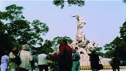 “五羊石像”是廣州最著名的景點(diǎn)之一。建于1959年,整座用一百三十塊花崗石雕刻而成,連基座高十余米。這座石雕有一個美麗的傳說,傳說在兩千多年前,廣州這地方,海天茫茫,遍地荒蕪,人們辛勞終日難得溫飽。一天,天空仙樂繚繞,有五位仙人身穿五彩衣,騎著口含六束谷穗的五只羊飛臨廣州,把谷穗留給廣州人,并祝愿這里年年五谷豐登永無饑荒,然后駕云騰空而去,羊化為石。從此,廣州成了富繞的地方,這動人的傳說世代相傳,廣州也因此得名“羊城”、“穗城”。 五仙人故事—在中華人民共和國建國40周年之際,為進(jìn)一步美化環(huán)境,在上級領(lǐng)導(dǎo)的關(guān)懷下,公園又在五羊石像下將五羊仙故事內(nèi)容,由原作者尹積昌主持創(chuàng)作浮雕兩組,并增設(shè)牌坊、亭、臺、廊、碑石等建筑,將景區(qū)擴(kuò)大到近萬平方米,景點(diǎn)總稱為五羊仙庭。
