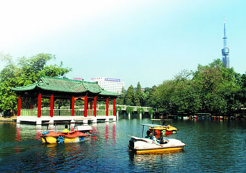 岸邊的蒲葵,小島內容豐富的植物叢中不時有小動物嬉戲、有小鳥在湖邊小憩,夏日湖上還有盛開的荷花,陣陣荷香撲鼻。遠望高聳入云的電視塔,駕船游湖,別有一番情趣。