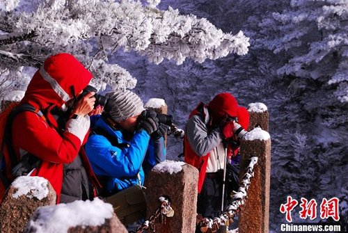 元月3日,安徽黃山吸引了大批攝影愛好者攝冬雪。王輝攝 1月3日,安徽黃山風(fēng)景區(qū)呈現(xiàn)壯麗冬雪、霧凇和云海景觀,中外游客驚喜不已。 新年的黃山,從頭到腳都是新的。皚皚白雪,遍鋪峰巒,處處銀妝素裹,冰雕玉砌,置身其間,仿佛進入撲朔迷離的童話世界。來自廣東的方先生說,他們一家三口是看了天氣預(yù)報,專門趕到黃山上過元旦的“天氣預(yù)報說今天可能下雪,就留在山上,果不其然下雪了!不虛此行。”據(jù)資料,黃山的冬季比較長,其中12月至翌年2月為最旺雪期,滿山飄雪,也是冬游的最佳季節(jié)。 “一夜寒風(fēng)起,萬樹銀花開”。百里黃山,一夜之間裝扮成一片銀白,滿樹滿枝的冰掛、霧凇、雨凇,猶如珠簾長垂,遍布峰體,風(fēng)吹樹動,冰掛撞擊,萬籟有聲,宛如一曲曲動聽的音樂,和諧有節(jié),清脆悅耳,猶如天上的廣寒宮,海中的珊瑚島。 “天宇雄渾之奇特景象”云海是冬游黃山的又一大奇觀。今日的黃山,云海氣勢磅礴、雄奇壯美,以酣暢淋漓的大筆觸揮灑而就,比平時顯得更加奇絕壯觀。現(xiàn)為觀賞黃山云海的最佳季節(jié),雨雪初晴,如果遇到持續(xù)天晴、風(fēng)小,云海比較穩(wěn)定,有時云海能持續(xù)長達(dá)三天之久,且較為壯觀。 據(jù)悉,黃山已在執(zhí)行淡季票價,至次年2月28日結(jié)束。在此期間,該景區(qū)門票價格為150元/人,索道票(單程)為65元/人,景區(qū)酒店房價普遍優(yōu)惠30%以上。同時,該景區(qū)對國內(nèi)游客乘坐飛機,由黃山航空港進入來黃山旅游,憑本人有效居民身份證件(暫住證,或居住證)和抵達(dá)黃山航空港的登機牌可享受門票淡季價格八折優(yōu)惠,即每張120元。 據(jù)氣象部門預(yù)報,黃山風(fēng)景區(qū)4日至12日為晴到多云與陣雪天氣相間,有利于賞雪并多現(xiàn)大美日出、壯美云海景觀。