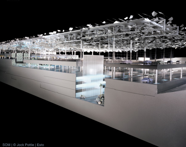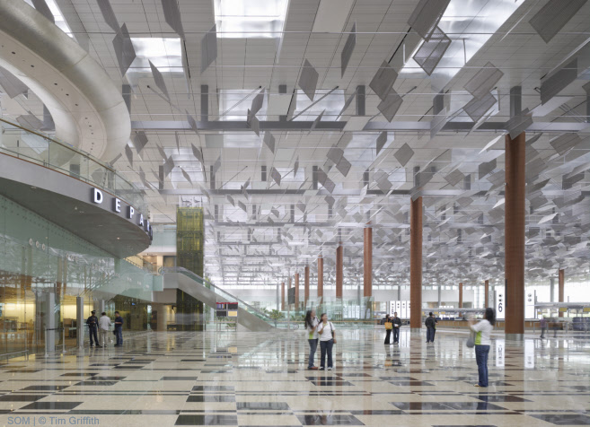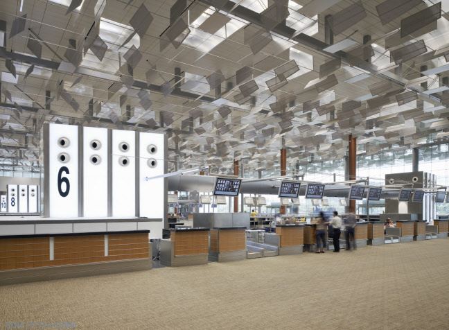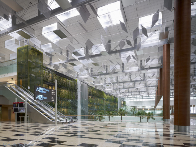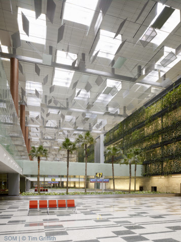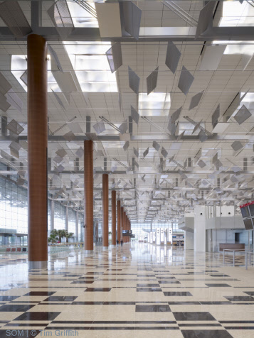 樟宜國(guó)際機(jī)場(chǎng) - 3號(hào)航站樓 設(shè)計(jì)單位:SOM 完成時(shí)間:2007 場(chǎng)地面積:693,920平方英尺 建筑高度:30m 所在國(guó)家:新加坡 作品地址:樟宜 獲獎(jiǎng)情況:2008·世界建筑節(jié):入圍獎(jiǎng)2005·城市景觀/建筑評(píng)論·入圍獎(jiǎng)2004·芝加哥雅典娜藝術(shù)與設(shè)計(jì)博物館·美國(guó)建筑獎(jiǎng)2003·美國(guó)建筑師協(xié)會(huì)紐約市分會(huì)?設(shè)計(jì)獎(jiǎng)項(xiàng)目2001·建筑雜志·P/A獎(jiǎng)2001·芝加哥雅典娜藝術(shù)與設(shè)計(jì)博物館·美國(guó)建筑獎(jiǎng) 案例簡(jiǎn)介: 新加坡樟宜機(jī)場(chǎng)分階段的總體規(guī)劃中最新增加的元素——新的航站樓占地22英畝,由鋼架作為基礎(chǔ),鋼纜支撐屋頂。自動(dòng)光調(diào)制系統(tǒng)包含玻璃天窗和數(shù)以千計(jì)的鋁百葉窗。白天,這些百葉可以調(diào)整位置,以限制或增加光量,以便不再需要人工照明。晚上,人工光線從百葉窗上反射出來以提供統(tǒng)一的照明。
