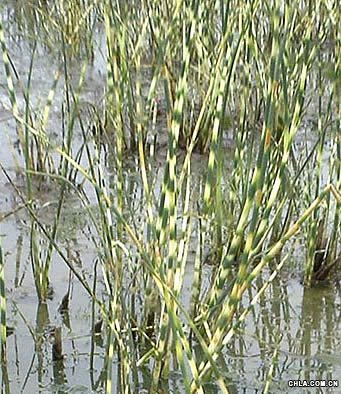 水蔥主要變種有南水蔥(Scirpus validus var. laeviglumis Tang et Wang)與原種的不同之處是鱗片上無銹色突起的小點。花葉水蔥(Scirpus validus cv.zebrinus)(見照片)與原種的區(qū)別是圓柱形莖稈上有黃色環(huán)狀條斑,比原種更具觀賞價值。