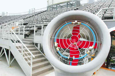 圖③:北京朝陽公園沙排場場內放置的強功率降溫風扇。