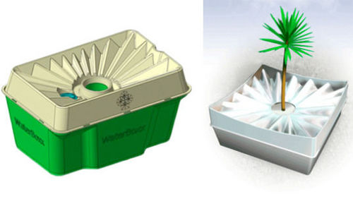 Waterboxx是一個直徑50厘米的圓形聚丙烯容器。收集到的雨水和凝結水蓄積在箱體的內腔。箱底有一條毛細管直通地面,將水引導到植物的根部進行滴灌。同時,Waterboxx也能保護植物不受風,野以及嚙齒動物的侵害。隨著植物一天天長大,其根系也一點點的深入地下,最終能夠憑借自己的根系獲得地下水,這時Waterboxx也就完成了自己的使命。