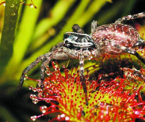 據(jù)美國《科學(xué)》雜志在線新聞報道,科學(xué)家所討論的物種是茅膏菜(Drosera capillaris)和以昆蟲為食的狼蛛(Sosippus floridanus)。為了捕捉昆蟲,茅膏菜會用黏液形成的小珠覆蓋在它們的葉片上,并用消化酶處理掉這些食物;而狼蛛則會織出密集的蛛網(wǎng)。茅膏菜和狼蛛都生活在美國佛羅里達(dá)州南部潮濕的沼澤附近,并且都以不同種類的小蟲為食,例如蒼蠅、螞蟻、蟋蟀以及跳蟲。這種交集不由得讓坦帕市南佛羅里達(dá)大學(xué)的生態(tài)學(xué)家Jason Rohr尋思——這兩個物種是否也會為了資源而戰(zhàn)。