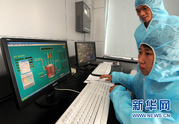 資料圖片:工作人員在控制室查看閉鎖型育苗室營養液供應情況(8月19日攝)。新華社記者 張旭 攝
