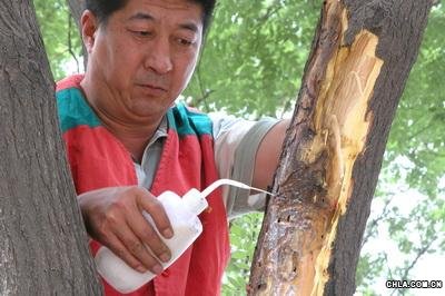 橋西區蒼槐街關帝廟內的千年古槐恢復生機 四株古槐“手術”獲新生 記者了解到,從去年年底開始,石市園林部門聘請古樹修復隊共為四株古槐樹實施了古樹修復“手術”。 而這四株古槐都是石市廣為人知的古樹名木,分別是:裕華區東崗頭的古槐,樹齡1000多年;橋西區蒼槐街關帝廟內的古槐,樹齡1000多年;新華區西三莊村的古槐,樹齡800多年;長安區北宋村的古槐,樹齡500多年。 記者了解到,這四株古樹由于樹齡都超過500年,所以是國家一級古樹。由于長期經受風吹雨打,已變得滿目瘡痍。 修復后,這四株古槐的樹洞被填充,樹皮進行移植修復,樹干也用鋼架支撐。古樹煥發了第二春。 古樹“動手術”不比人簡單 談到給古樹“動手術”,古樹修復隊負責人尤亮說,給古樹“動手術”并不比人簡單。據介紹,去年,在石市園林局領導的支持下,從事綠化工作的尤亮去年底成立我省首支專業古樹修復隊。 尤亮告訴記者,給樹“動手術”時,首先要對中空的樹心進行清理,除去腐爛的部分,并進行消毒。接下來,將一種海綿狀材料填充到樹心內部。 “以前修復古樹用水泥鋼筋,材料和樹干結合得不緊密,時間長了就起不到保護作用。”尤亮說,這次對古槐修復使用的是新型天然材料,可以防水、防火、防滲透,而且和古樹緊密結合,保證修復后的古槐與原來的風格外貌一致。 接下來的工序是“植皮”,將從木材加工廠買來的貨真價實的老槐樹皮,粘貼在老樹干裸露的外部。“必須用槐樹皮,這是因為相同木材的膨脹系數相同。”尤亮說,“修復的過程講究細致,除蟲、烘干、填充、外圍修補,每道工序都是技術與經驗的完美結合。”據介紹,修復一株古樹大概需要十多天。