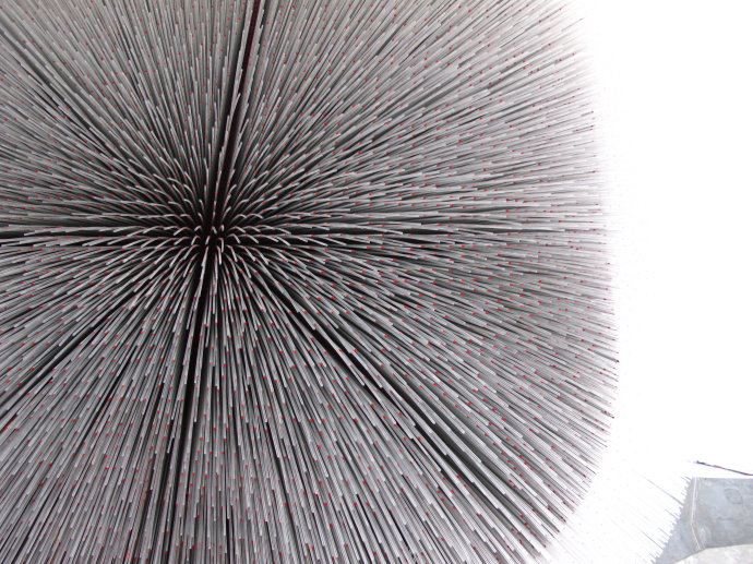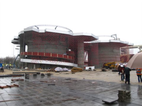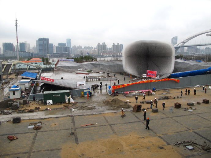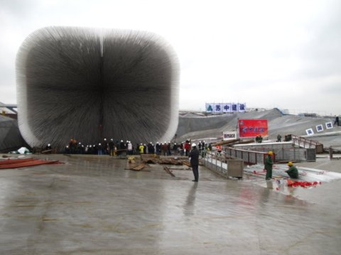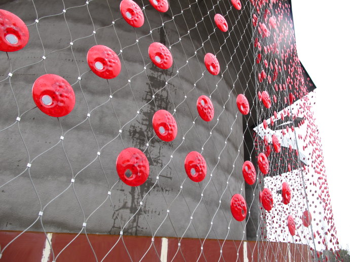大家的參觀興趣點普遍轉移到了國外自建館區。相比主場館區,這些建筑大不相同,因為體量小、功能簡單自由,并且作為臨時建筑,可以采用非常態的設計方式,從而創造力得到了肆意的發揮。 英國館是最讓人驚艷的展館。這個被同事戲稱為“小刺猬”的設計一開始時讓人看不懂究竟,其實是插在建筑表面的數以千計的雅克力條達成了建筑的效果。它除了構成新奇的視覺感,也是室內外之間一個趣味的光導裝置,白天雅克力條可以把外面的陽光如繁星般的引入室內,晚上又把室內的燈光導出至雅克力桿的端部,形成美侖美幻的夜景效果。 ![]() ![]() ![]() 瑞士館是最富游戲感和環保趣味的展館。這座建筑目前尚未完工,建筑由一層如國境線般曲折的表皮圍合,在效果圖上顯得亦真亦幻,這層表皮由植物纖維樹脂材料附著在金屬網上構成,據說樹脂材料在世博會結束時自然的絳解消失。立面上許許多多紅色的掛片,用白天吸收的太陽能點亮夜間滿墻的紅色光斑。人們可以坐著纜車在建筑內外盤旋、上上下下,觀賞展館內外的景象,直至一個綠意盎然的屋頂。