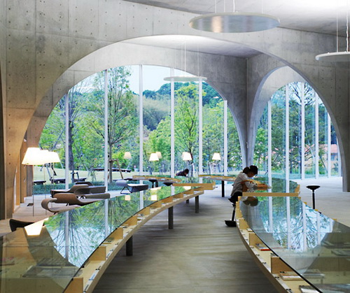 這些管道似乎被安排成一種松散的、幾乎是無規(guī)則的圖形。在你靠近些時,你看見它們向下延伸,穿過了整個建筑物,連接地面。它們不僅支撐這幢大樓,它們還容納電梯、樓梯和機械系統(tǒng)。陽光從巨大的、由電腦控制的鏡子反射,在白天,給這幢建筑物一種虛幻的光芒。伊東豐雄對參觀這幢大樓的筆者說:“這些管道通常比喻為森林里的樹木。但它們也像日本花園里的東西。在花園里,空間隨著一些‘點’——例如池塘或石頭的安排變動。” 這種思想從身體上和心理上使我們從格子的僵化和它所暗示的東西——笛卡爾羅輯(Cartesian logic)和個性的消除得到解脫。但這幢建筑物不是一個孤立的試驗。通過重復(fù)圍繞著它的傳統(tǒng)的板樓形式,并且大膽使它們變形,這些設(shè)計表明這座城市能夠更好地發(fā)展。 反古典的效果,開發(fā)想象的可能性 在兩年前完工的“多摩藝術(shù)大學(xué)圖書館”(Tama Art University Library),伊東豐雄的這種觀點呈現(xiàn)了較大的復(fù)雜性。這幢建筑物在校園內(nèi)一座單調(diào)的小山腳下,它被想象為精美的混凝土拱的不規(guī)則的格子。