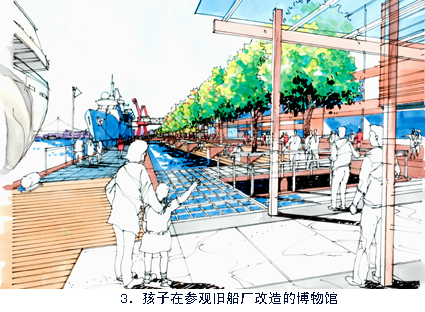 造船廠的一些原有元素,如船塢,滑道、起重機和鐵軌等,被作為船廠的歷史印記與特色融入整個濱水區域的組織結構中。作為一個城市的名片,舊的生產車間被利用改造成船博物館和藝術展覽館的綜合體。為了滿足游客需求,該區域內還設置了餐館、咖啡廳、旅游紀念品商店等休閑設施,并將其作為景觀結構的組成部分。