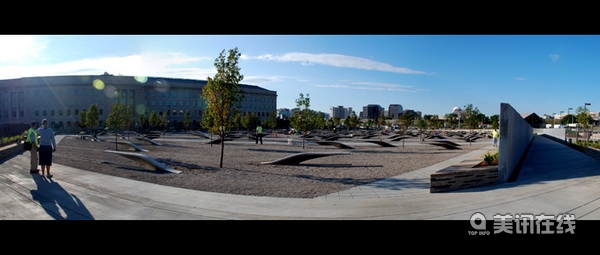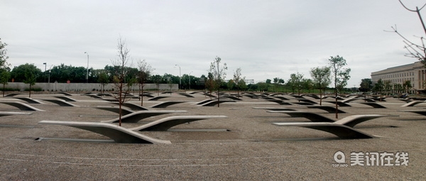 在911恐怖襲擊中,一架美國航空公司 Flight 77 航班的波音767飛機撞擊了五角大樓,造成184人遇難,為此事件修建的Pentagon Memorial(五角大樓紀念地)位于五角大樓的西南角,為紀念這次襲擊中184位遇難者而建,這個永久性的戶外紀念地在911襲擊事件后7年向公眾開放,美國總統布什參加了紀念儀式。