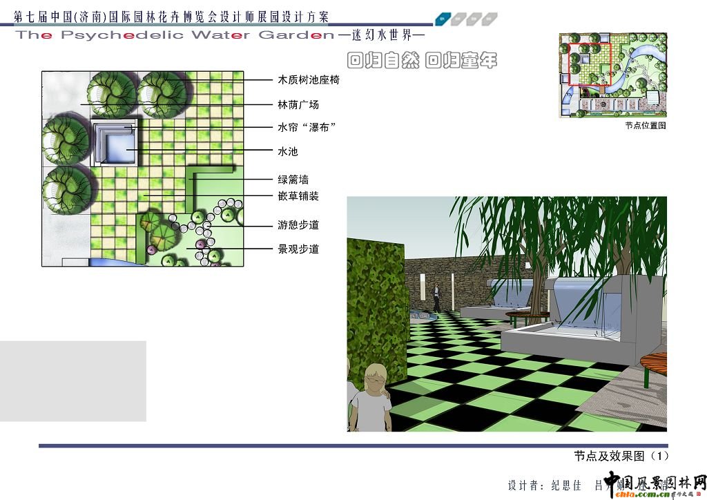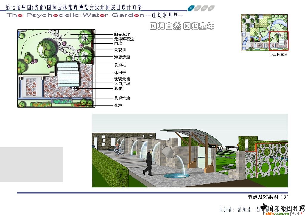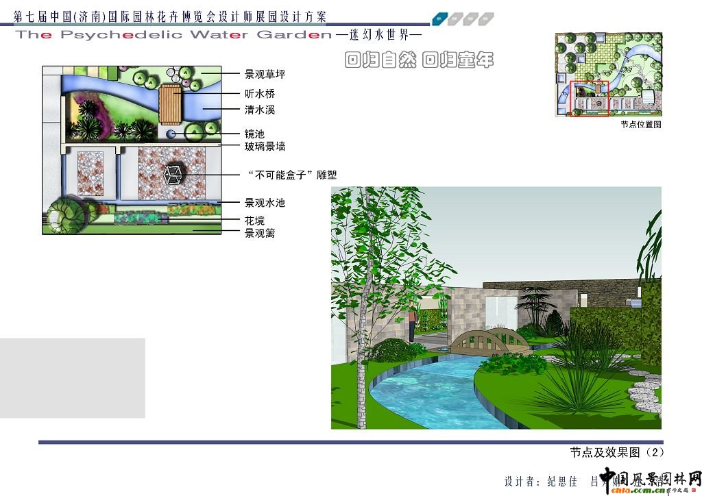 其一、以營建獨具特色的水景為主,運用了具有現代感的造景手法展示水的形態:壁泉、飛泉、幕泉、石上泉、跳泉等跳躍在各個角落,其中水汽彌漫的霧泉給小巧細致的園子帶來了夢幻般的景象。使園子的主題"Magic"得到展示。