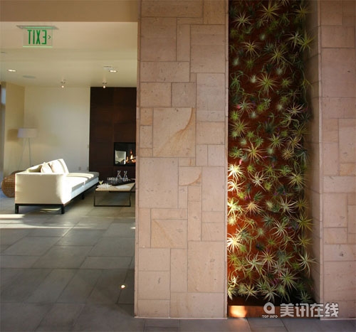 垂直綠化可以針對(duì)一些小空間設(shè)計(jì)的,無需澆灌,非常簡(jiǎn)單實(shí)用。這個(gè)由Kevin Smith和建筑設(shè)計(jì)師Seth Boor設(shè)計(jì)的加州Yountville酒店也采用了垂直綠化這一設(shè)計(jì)方式,所采用的植物為鐵蘭(鳳梨科植物)。大量的鐵蘭“浮”在凹壁上,形成具有視覺沖擊力的視覺效果,與酒店休息區(qū)的氛圍非常匹配。