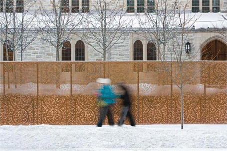 紀念靈堂和社團庭院位于城市優美的環境中,它和美國社會的死亡、葬禮相關,因而鼓勵著公眾的思想改變。設計中的關鍵因素是穿孔的金屬柵欄,它一方面借鑒了教堂肖像畫的技法另一方面作為一種半透膜融合了私人紀念空間和公眾空間。