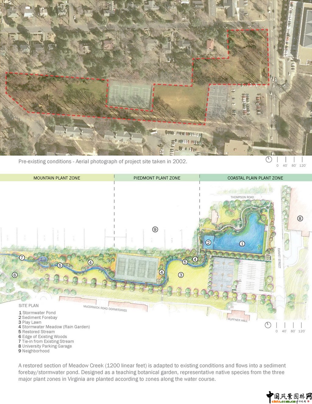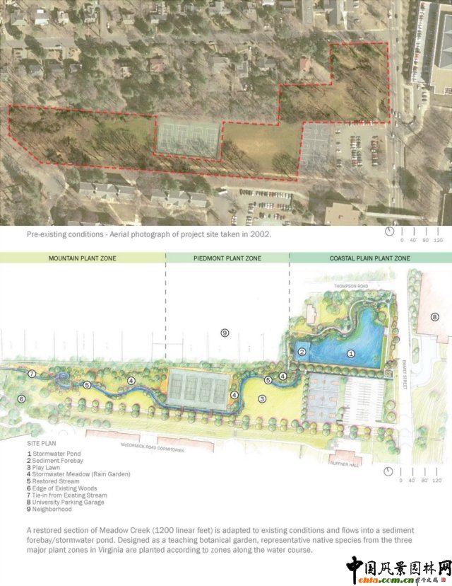 位于美國(guó)弗吉尼亞大學(xué)的這片谷地是一個(gè)11英畝的復(fù)合景觀(guān),它使這一區(qū)域一條消失的河流得以重現(xiàn)。將那些被遺棄和未得到利用的土地轉(zhuǎn)化成為一個(gè)先進(jìn)的雨水收集系統(tǒng)。這個(gè)公園的建立還使原本消失的野生動(dòng)物棲息地得以重現(xiàn),并且提供了多種的娛樂(lè)方式使學(xué)校和鄰近社區(qū)相聯(lián)系,為游客和弗吉尼亞大學(xué)學(xué)生和教職員工提供了一個(gè)難忘的入口示范景觀(guān)。