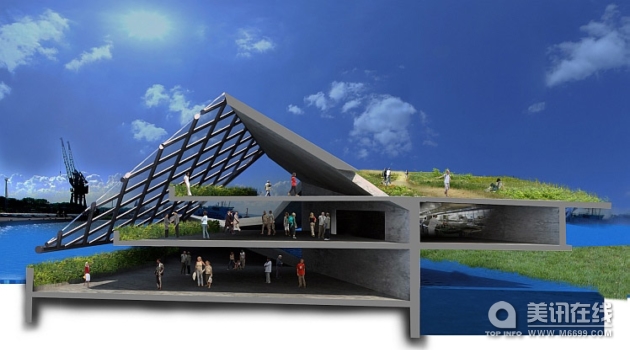 “該概念設(shè)計方案是一種簡單的假設(shè)。由時間構(gòu)成三個主體部分,分為:過去、現(xiàn)在和未來。過去該地區(qū)起重機廠和造船廠工人頑強斗爭歷史。今天解放了的人們有了自由的道路。未來是未知的,沒有定義的。”