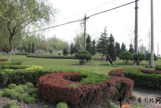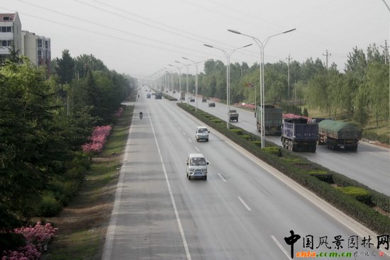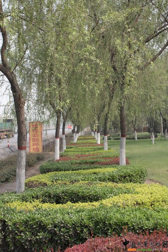 西環(huán)路北起北環(huán)路,南至南環(huán)路,建于2000年,道路總長3km、寬70m,公路綠化為二板三帶式,綠化面積為8.65公頃,中間分車帶種植草坪及金女貞和造型花壇,在不同的季節(jié)種植花,春有虞美人,夏植菊花、小麗花等,道路兩旁綠地以豐花月季和百日紅交替種植,開花季節(jié),整條道路姹紫嫣紅、分外迷人。同時(shí),綠帶旁種植有四行樹,以雪、毛白楊、垂柳等大型喬木為主,同時(shí),栽植紫穗槐形成高低交錯(cuò)層次分明的美化經(jīng)化效果,使整體路段滿目青翠,花團(tuán)錦簇,賞心悅目。