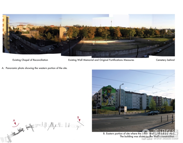 A頂部:地點(diǎn)西面的全景圖;B底部:東面為柏林墻防御工事所在地 因柏林墻的建造建筑已經(jīng)被切割成了薄片。