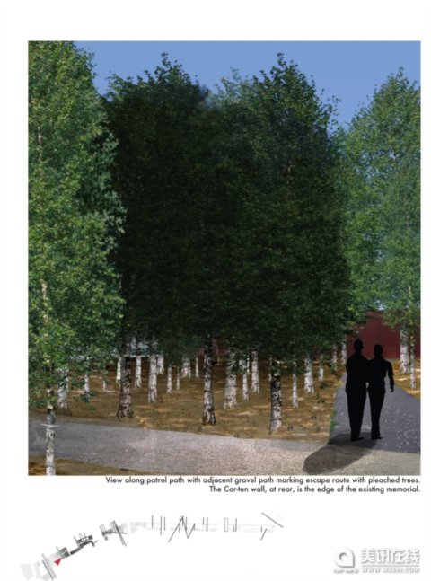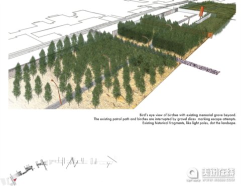 現(xiàn)存紀(jì)念樹林鳥瞰圖。中斷現(xiàn)存的巡邏通道和樺樹林的碎石路是逃亡路線的標(biāo)志。現(xiàn)存的歷史殘留物有路燈,以此點(diǎn)綴了景觀