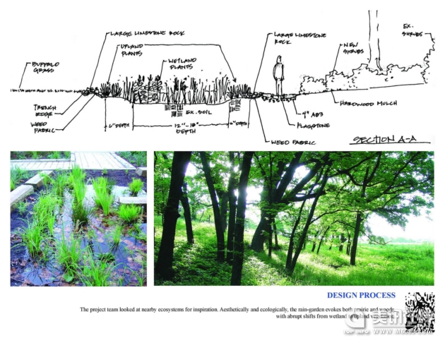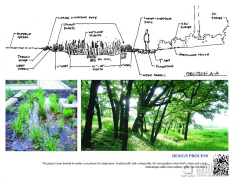 工程團隊的設計靈感來源于附近的生態系統。從美學角度和生態學角度上來說,雨花園中濕地植被到高地植被的突然轉換,使人們可以同時感受到牧場和樹林兩種生態系統。